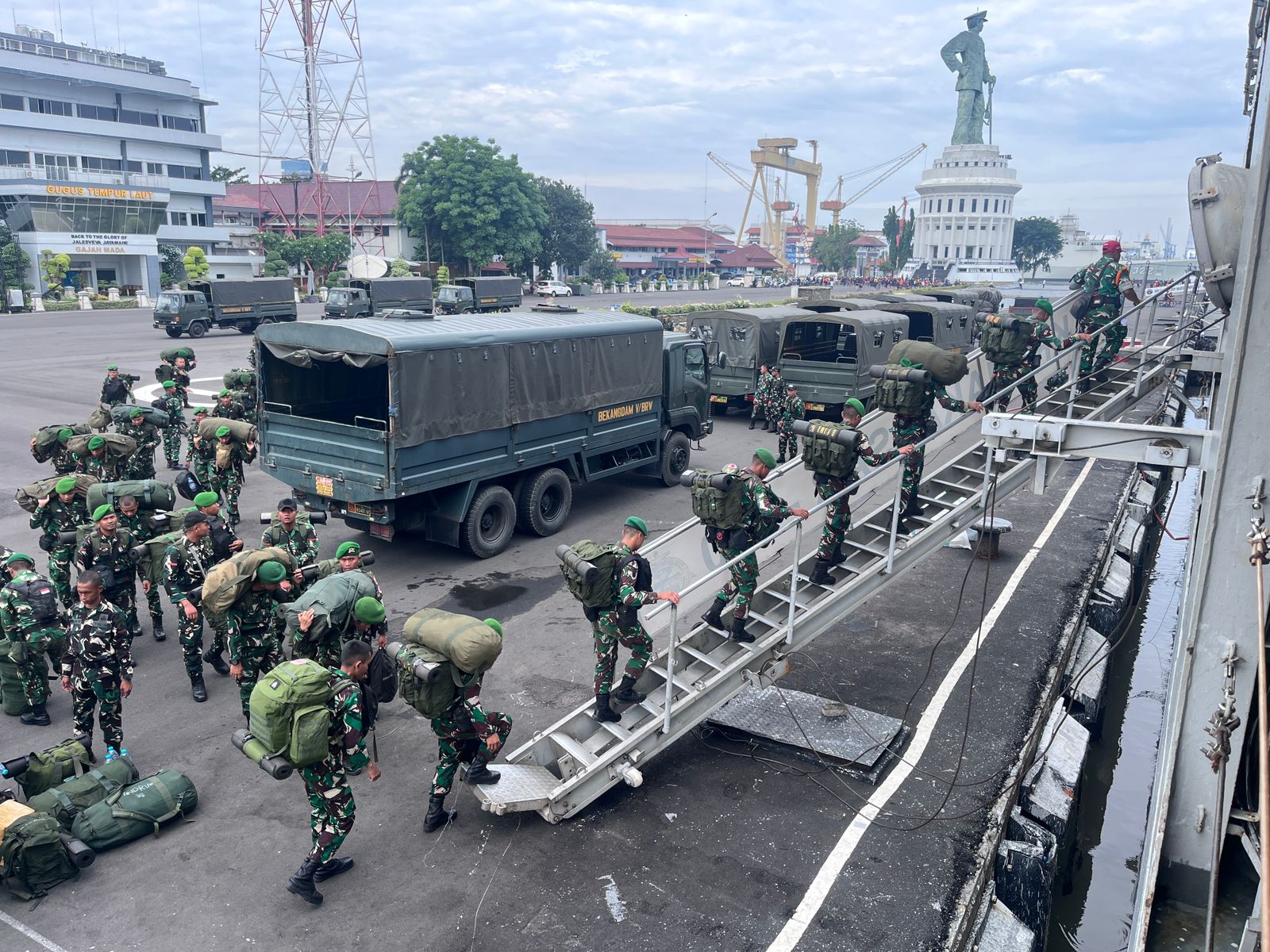 Kegiatan embarkasi tersebut berlangsung pada Minggu (4/1/2026), bertempat di Dermaga Madura Tengah, Koarmada II, Ujung Surabaya. Sebanyak 250 personel TNI AD ,yang terdiri dari 150 personel Yonif TP 836/BY Probolinggo, dan 100 personel dari Yonif 885/BP Bojonegoro turut diberangkatkan dalam misi kemanusiaan ini.